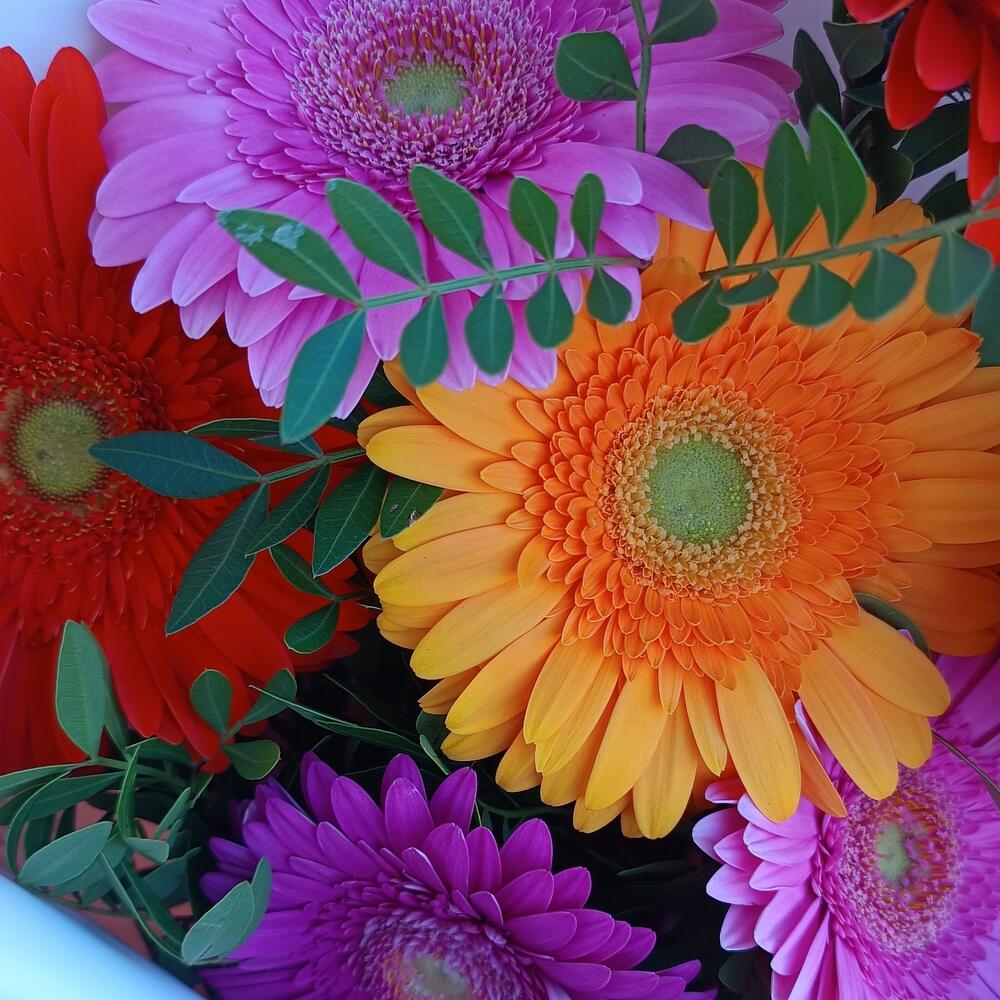 Весёлый микс ярких гербер подарит прекрасное настроение и море позитивных эмоций