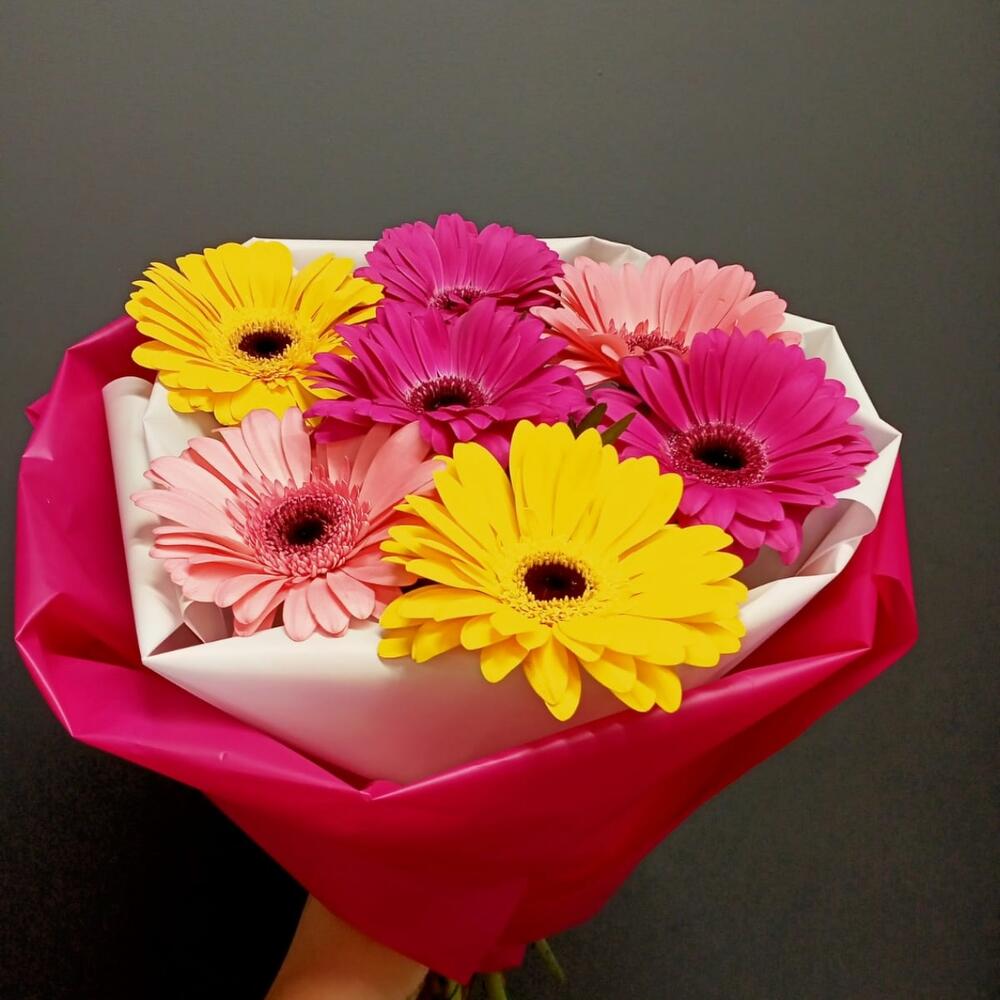 Гербера – 7 шт.зелень декоративная – 1 шт.Упаковка дизайнерская – 1 шт.