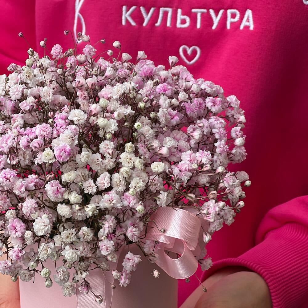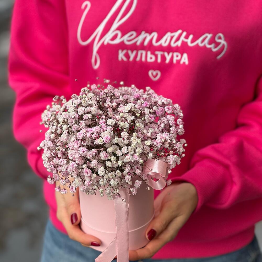 “Сиреневый туман” – композиция из гипсофилы в шляпной коробке