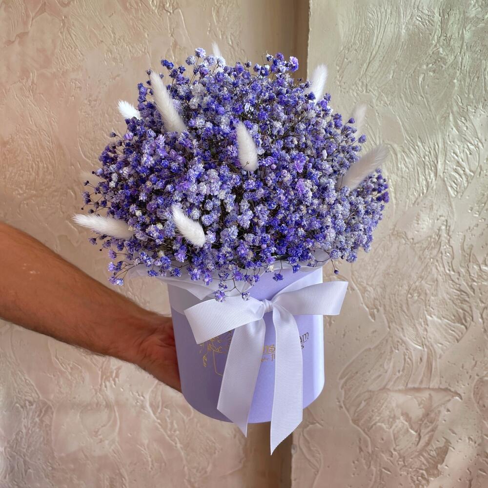 Гипсофила – 7 шт. Лагурус – 11 шт. Оазис флористический – 1 шт. Лента репсовая – 1 шт. коробка шляпная d15 – 1 шт.