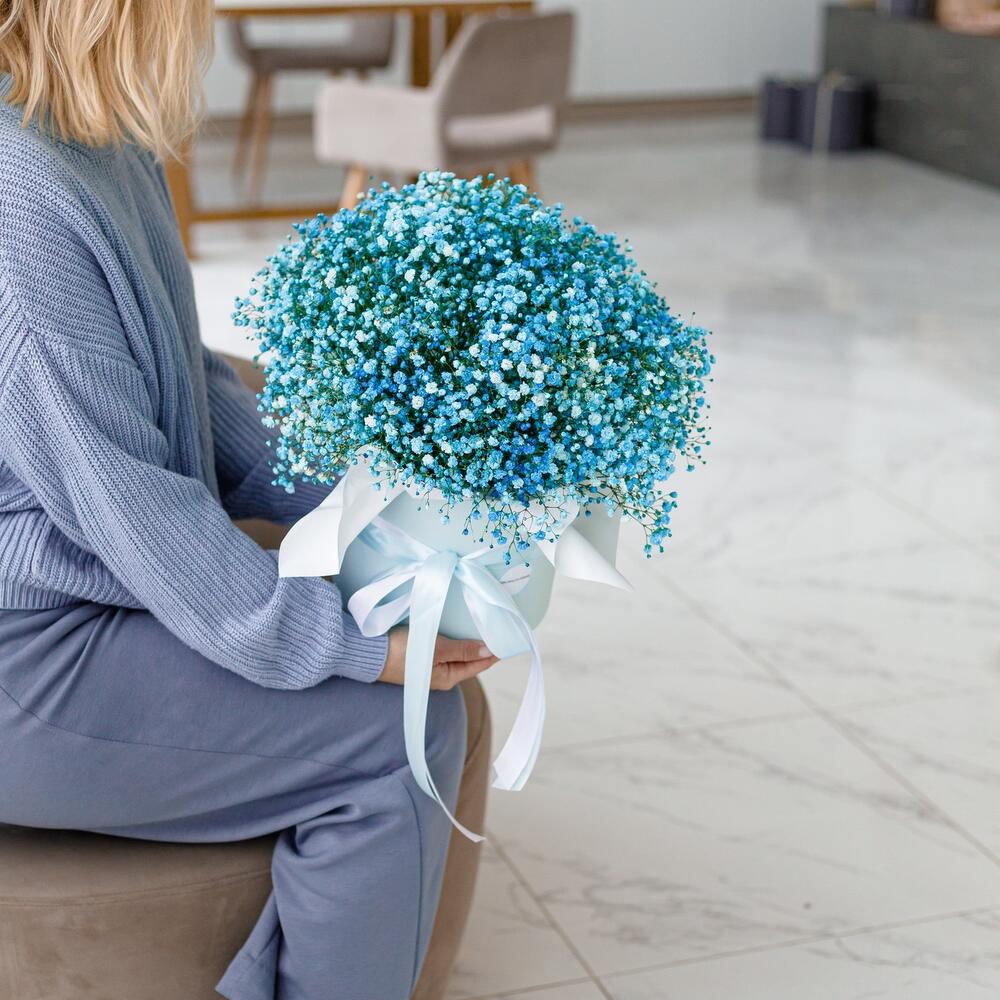 цветная гипсофила – 13 шт.Коробка шляпная – 1 шт.Губка флористическая – 2 шт.Лента атласная – 2 шт.Бумага тишью – 1 шт.