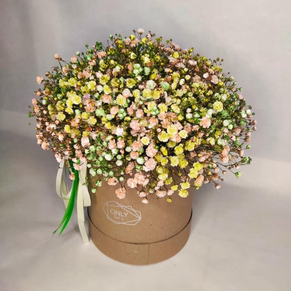 гипсофила микс – 8 шт.Шляпная коробка – 1 шт.Оазис флористический – 1 шт.