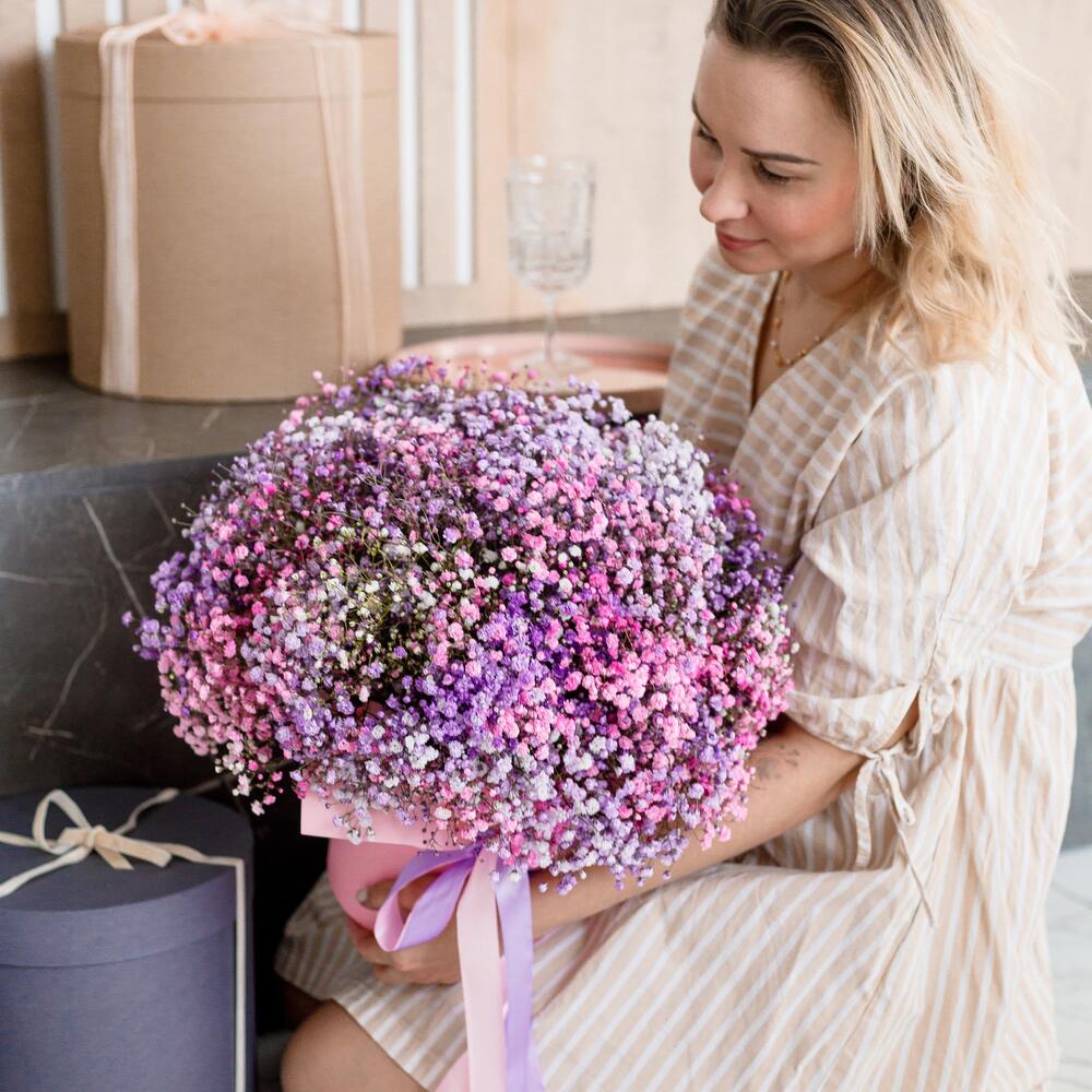 “Сиреневый туман” – композиция из гипсофилы в шляпной коробке