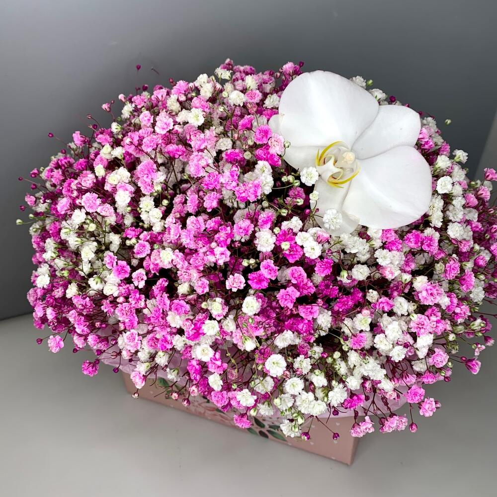 гипсофила радужная – 6 шт.орхидея фаленопсис цветок – 1 шт.Коробка – 1 шт.Тишью – 2 шт.Оазис флористический – 1 шт.Пленка прозрачная – 1 шт.Лента атласная – 2 шт.
