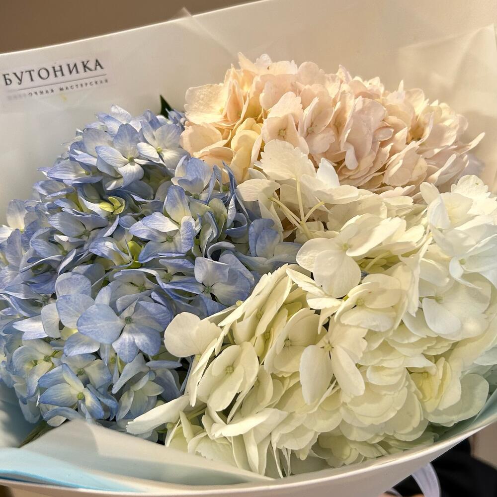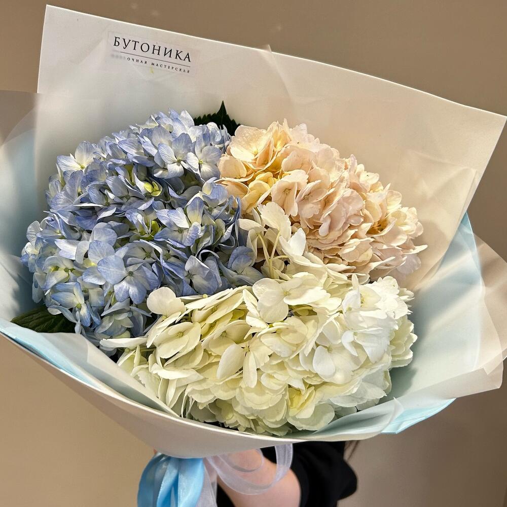 Гортензия – 3 шт.Лента атласная – 2 шт.Упаковка дизайнерская – 3 шт.