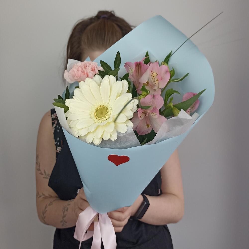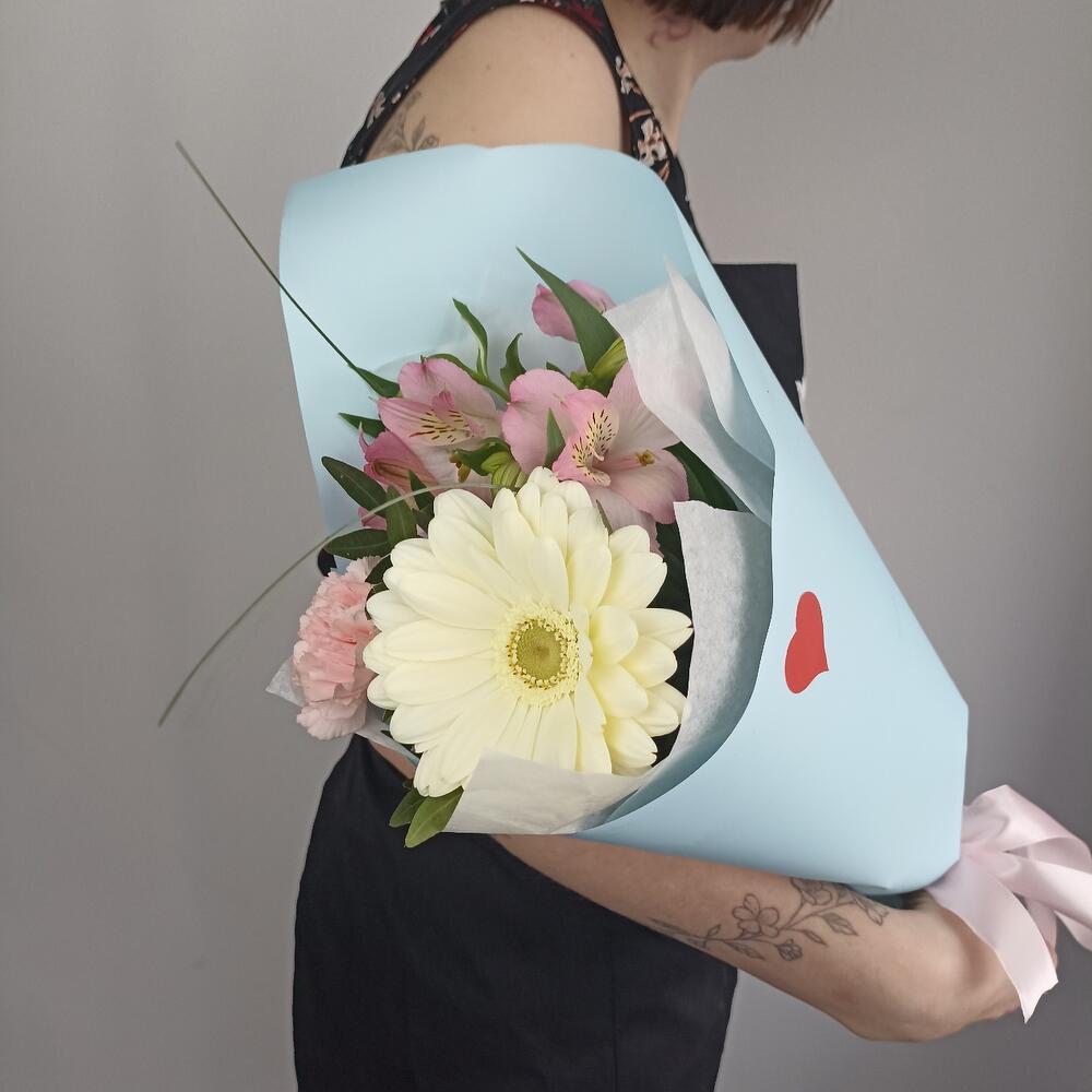 Гербера – 1 шт.Альстромерия – 1 шт.Диантус – 1 шт.Фисташка – 1 шт.Тишью – 2 шт.Пленка матовая – 1 шт.