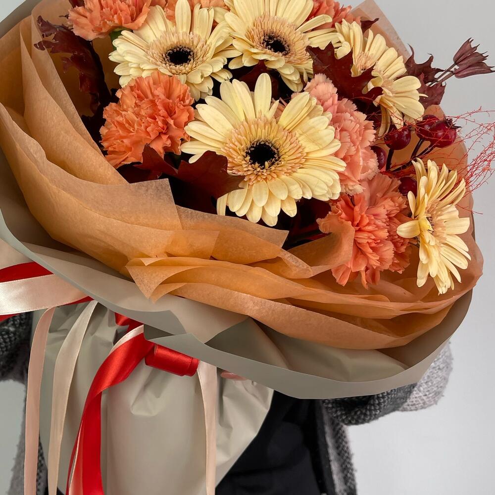 Гербера – 5 шт.Диантус – 7 шт.Дубовые листья – 3 шт.Ягоды декоративные – 1 шт.Упаковка дизайнерская – 2 шт.Лента атласная – 2 шт.