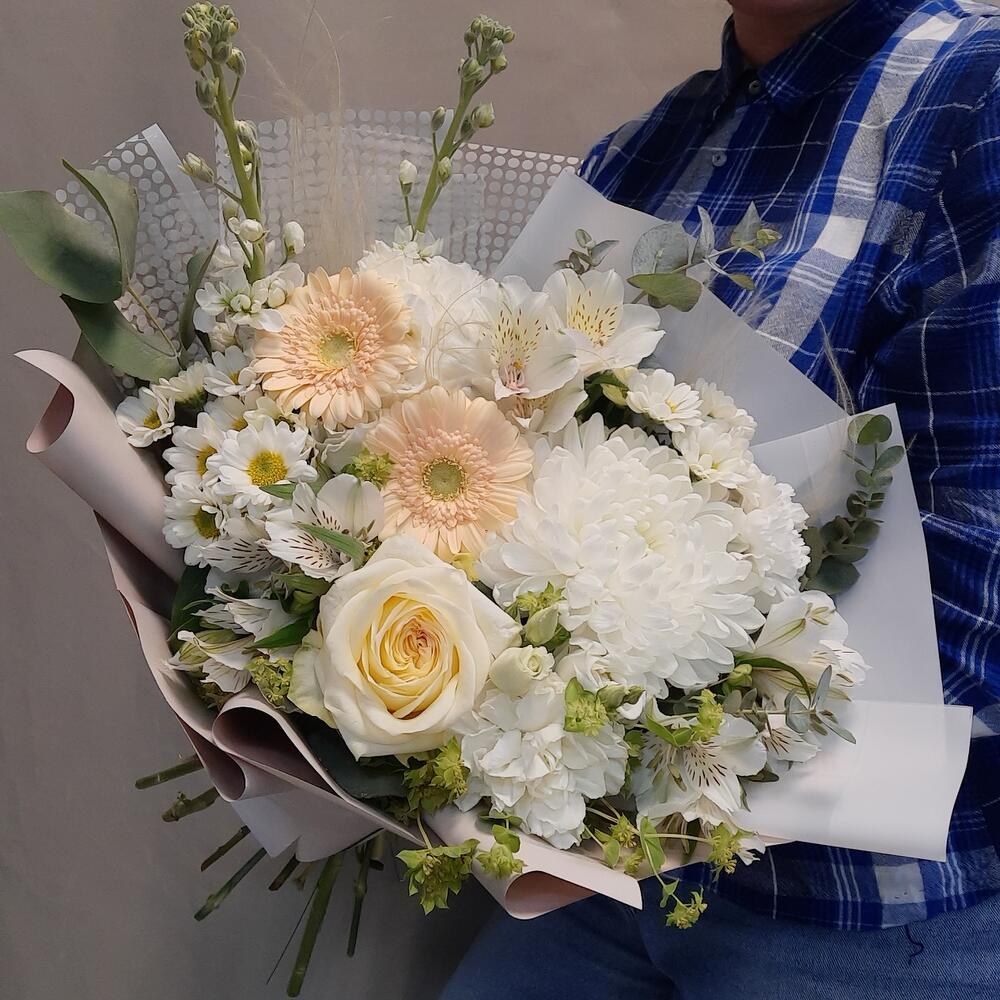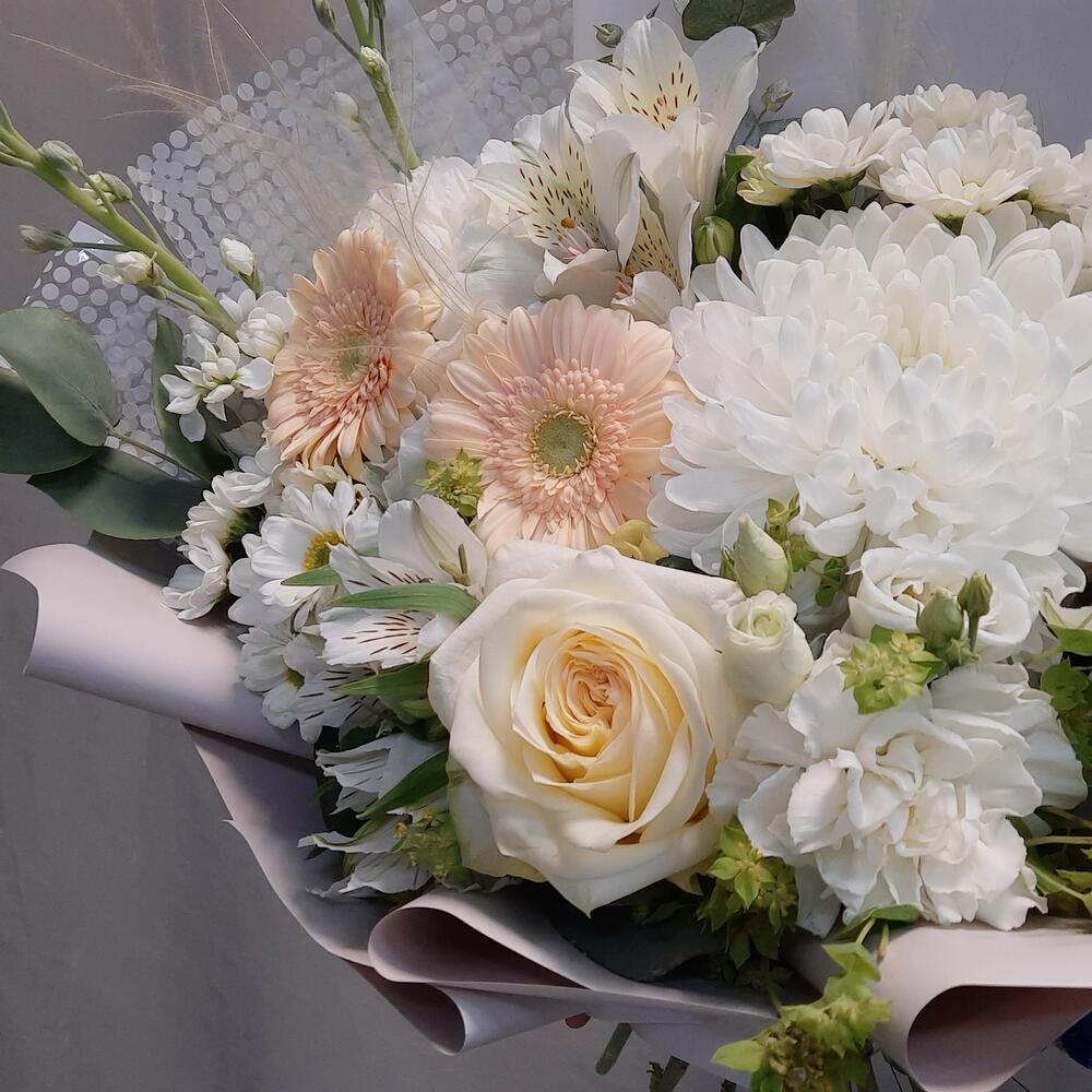 Роза – 1 шт.Гермини – 2 шт.Альстромерия – 3 шт.Сантини – 2 шт.Маттиола белая – 2 шт.Буплерум – 2 шт.Лизиантус – 1 шт.Диантус – 3 шт.ковыль (пучок) – 3 шт.Эвкалипт Baby Blue – 3 шт.Рускус – 12 шт.Упаковка дизайнерская – 2 шт.Лента атласная – 1 шт.антонов – 1 шт.