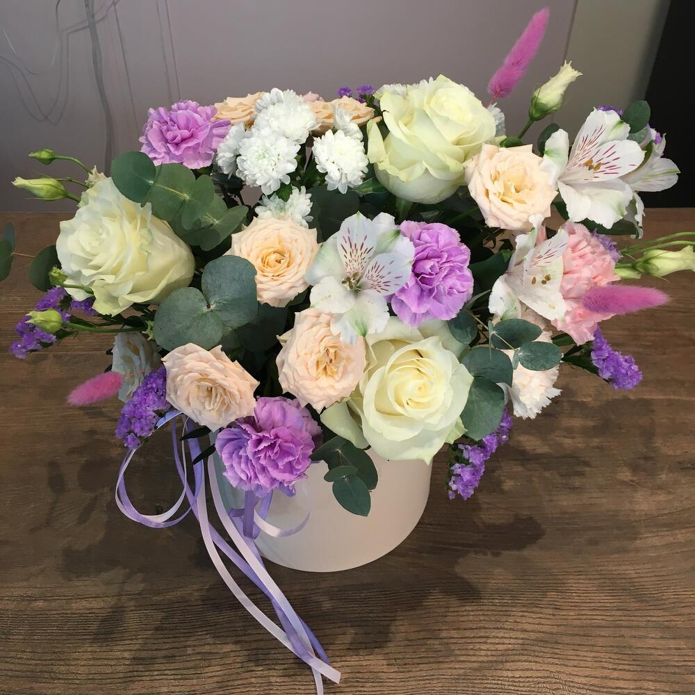 Шляпная коробка – 1 шт.Оазис флористический – 1 шт.Роза Эквадор – 3 шт.Роза кустовая – 2 шт.Гвоздика – 5 шт.Лагурус (сухоцвет) – 1 шт.Статица – 1 шт.эваклипт – 1 шт.Фисташка – 1 шт.Альстромерия – 2 шт.