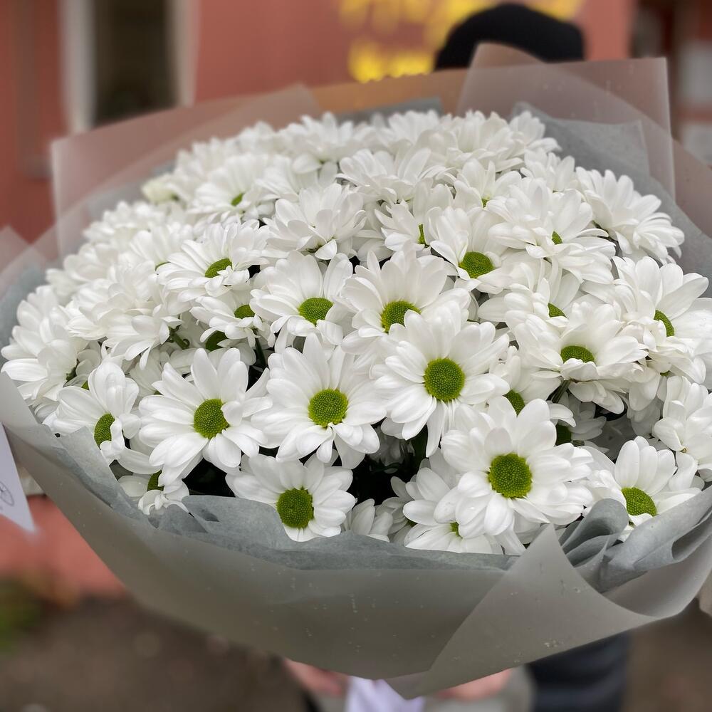 Букет из 11 веток ромашковых хризантем с оформлением , количество ромашек в букете может достигать 101 штуки .