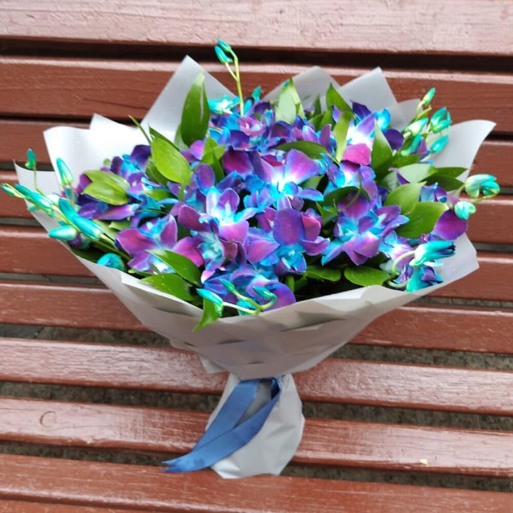 Орхидея дендробиум синяя – 45 шт.Дизайнерская упаковка – 2 шт.Рускус – 10 шт.Лента атласная – 1 шт.любовь флориста (бесплатно) – 1 шт.подкормка для цветов chryzal – 1 шт.инструкция по уходу за цветами – 1 шт.удлинитель для орхидеи – 22 шт.