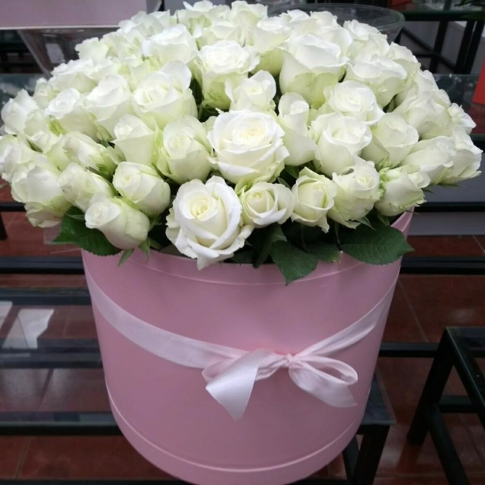 Роза белая – 151 шт.Коробка шляпная большая – 1 шт.Оазис флористический – 4 шт.бант атласный – 1 шт.