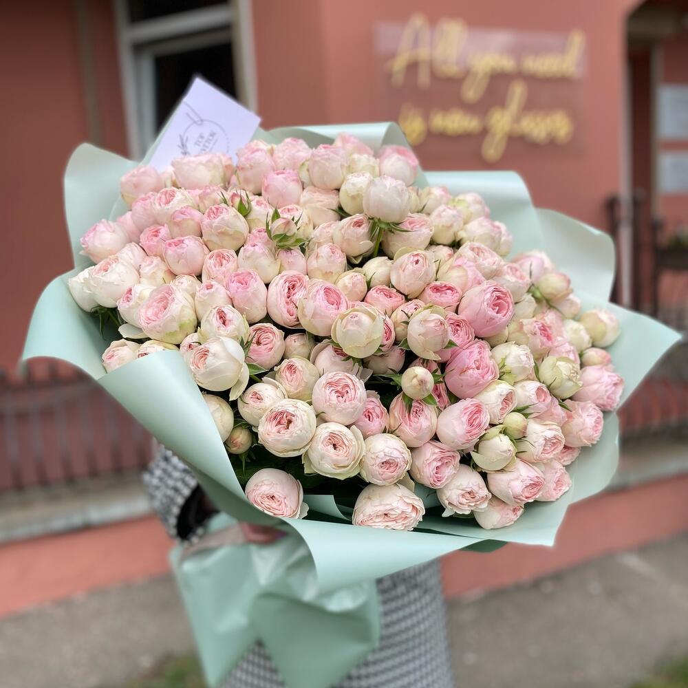 Букет из 35 кустовых пионовидных веток сорта Mansfield park в дизайнерском оформлении. Количество розочек(бутонов) может достигать 171 штучки