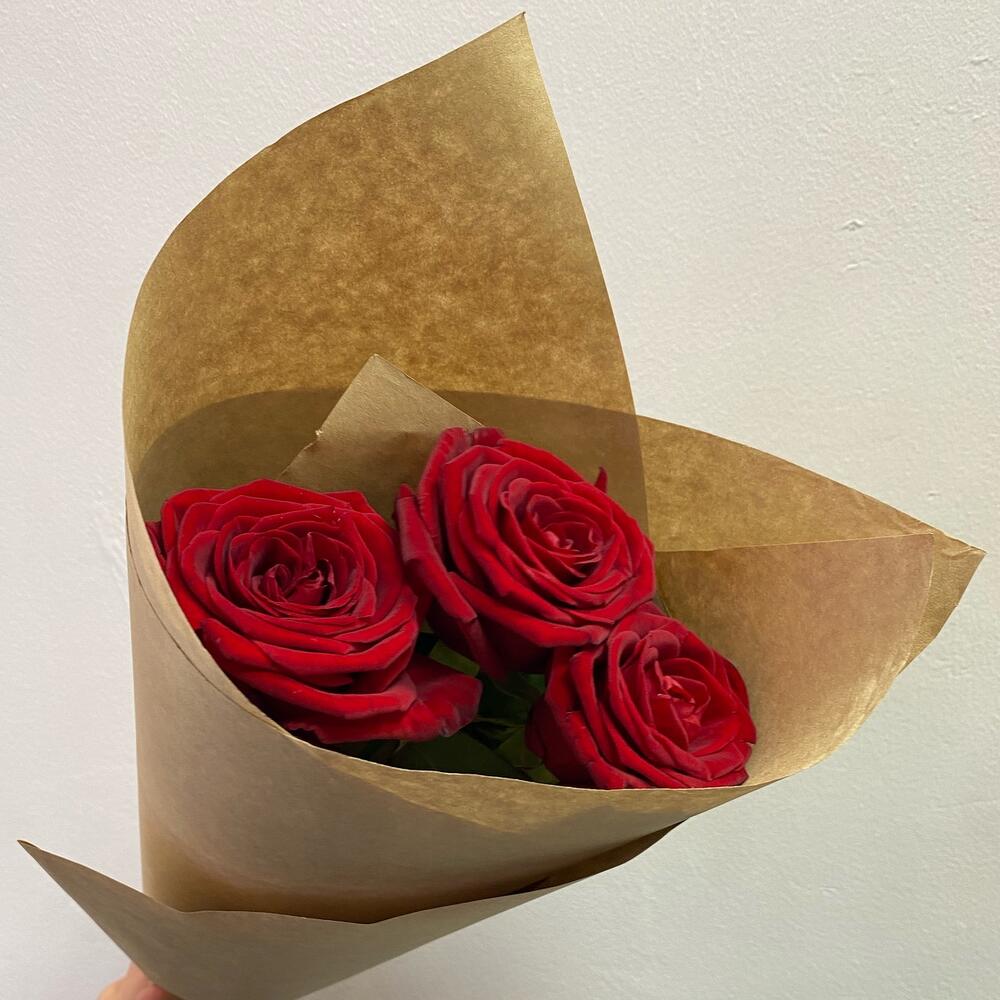 Роза красная – 3 шт.Крафт упаковка – 1 шт.Открыточка с вашими пожеланиями – 1 шт.