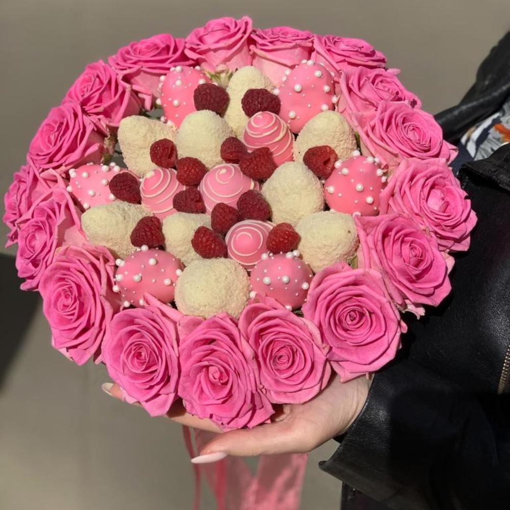 Клубника в шоколаде callebaut (бельгия) – 19 шт.Роза Эквадор – 17 шт.Малина – 150 гр.