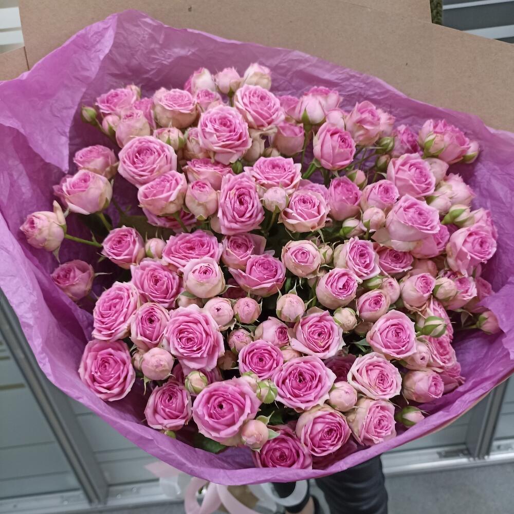Лента атласная – 2 шт.Роза кустовая розовая – 15 шт.Крафт упаковка – 3 шт.