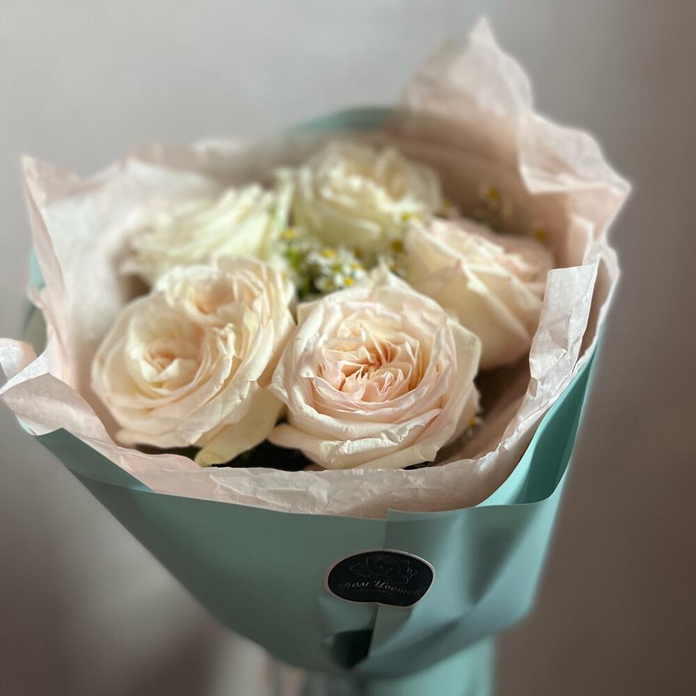 Пионовидная роза – 5 шт.Танацетум – 3 шт.декоративная упаковка – 1 шт.Атласная лента – 1 шт.