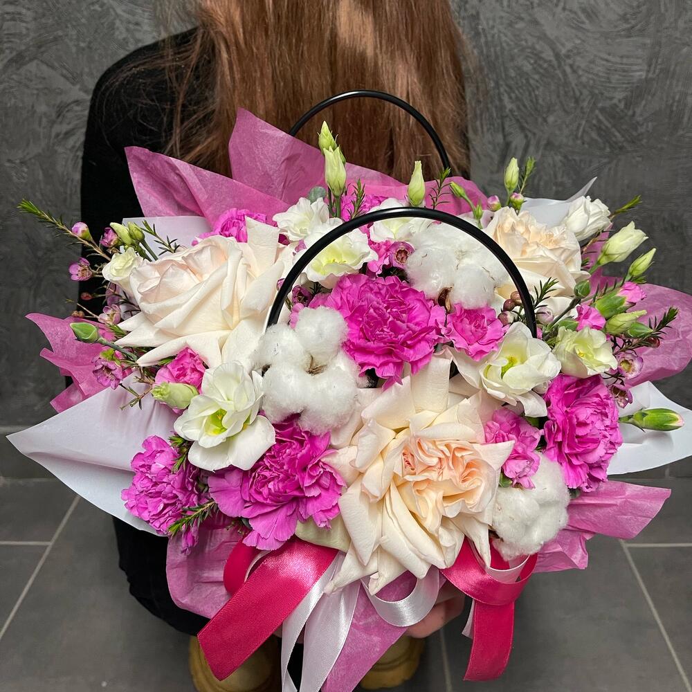 Ваксфлауэр – 4 шт.Лента – 3 шт.Лизиантус – 3 шт.Хлопок – 3 шт.Упаковка – 3 шт.Сумка – 1 шт.Диантус кустовой – 5 шт.Оазис флористический – 1 шт.Диантус сортовой – 5 шт.роза охара пионовидная – 3 шт.