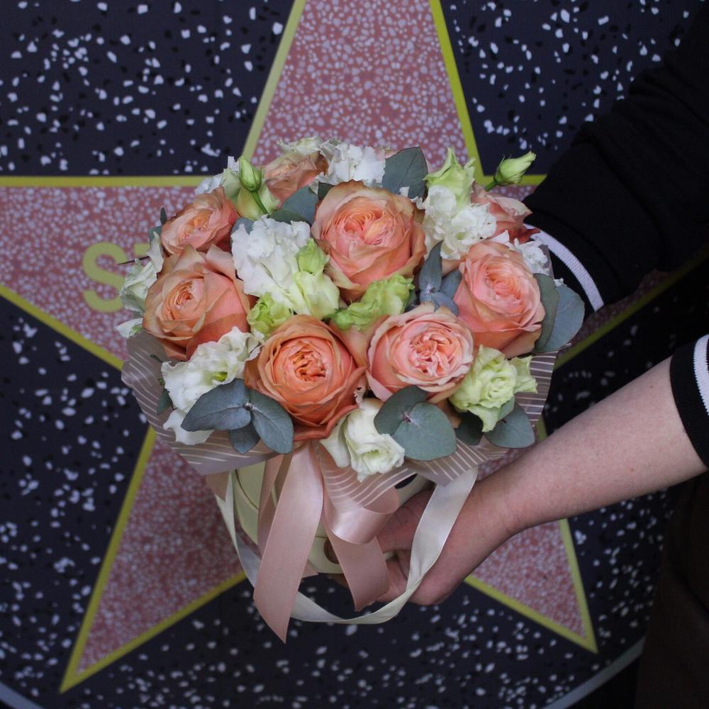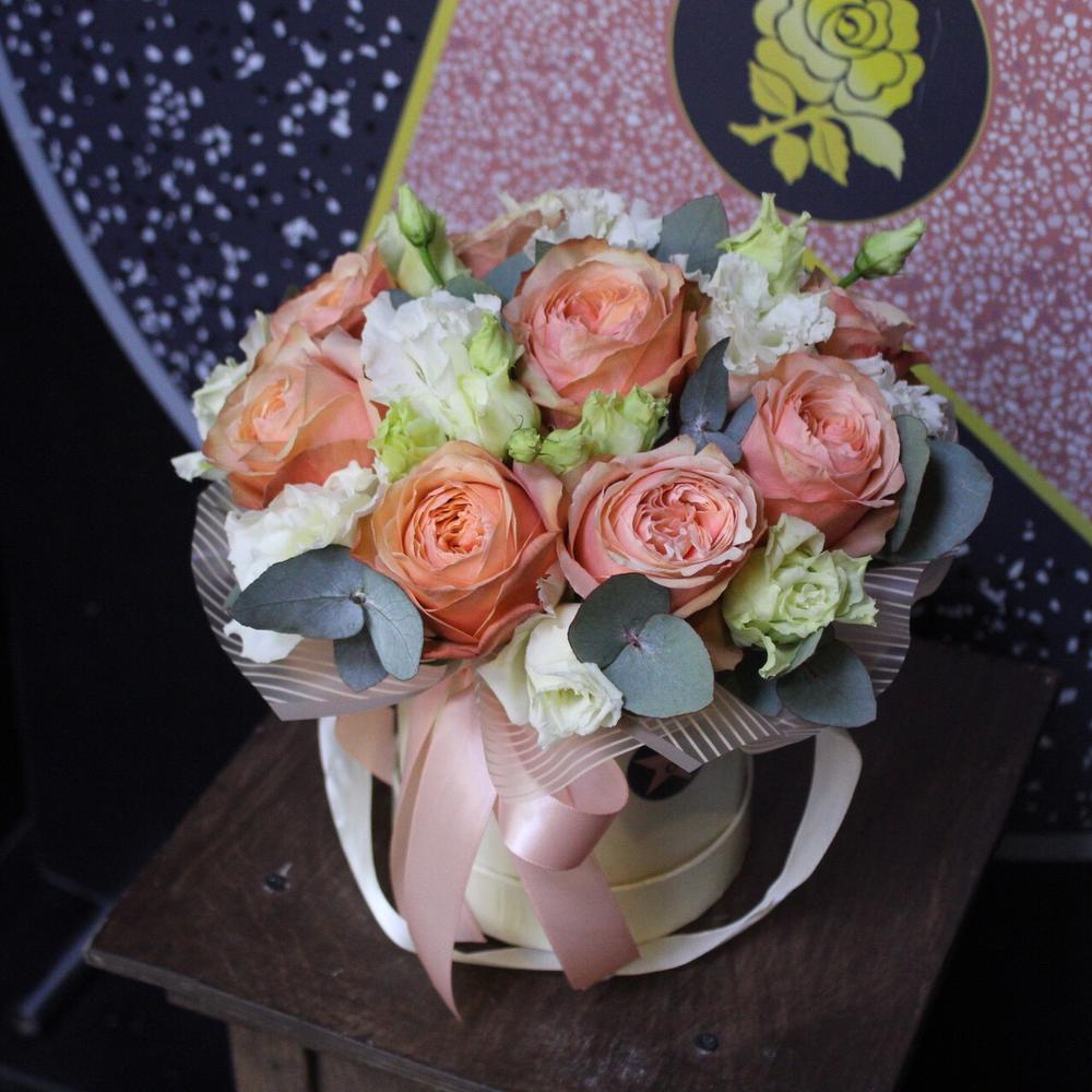 Роза пионовидная кахала – 9 шт.Эвкалипт – 3 шт.Пленка дизайнерская – 1 шт.Оазис флористический – 1 шт.Шляпная коробка – 1 шт.Лента атласная – 1 шт.эустома махровая – 3 шт.