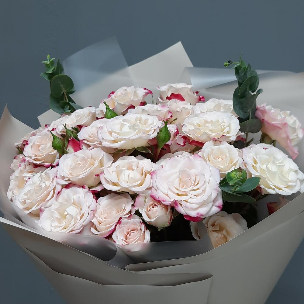 Роза кустовая – 7 шт.Эвкалипт – 2 шт.Упаковка дизайнерская – 2 шт.