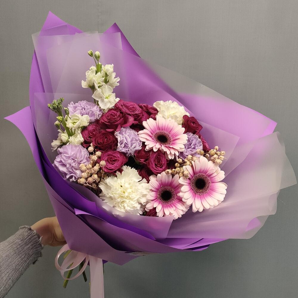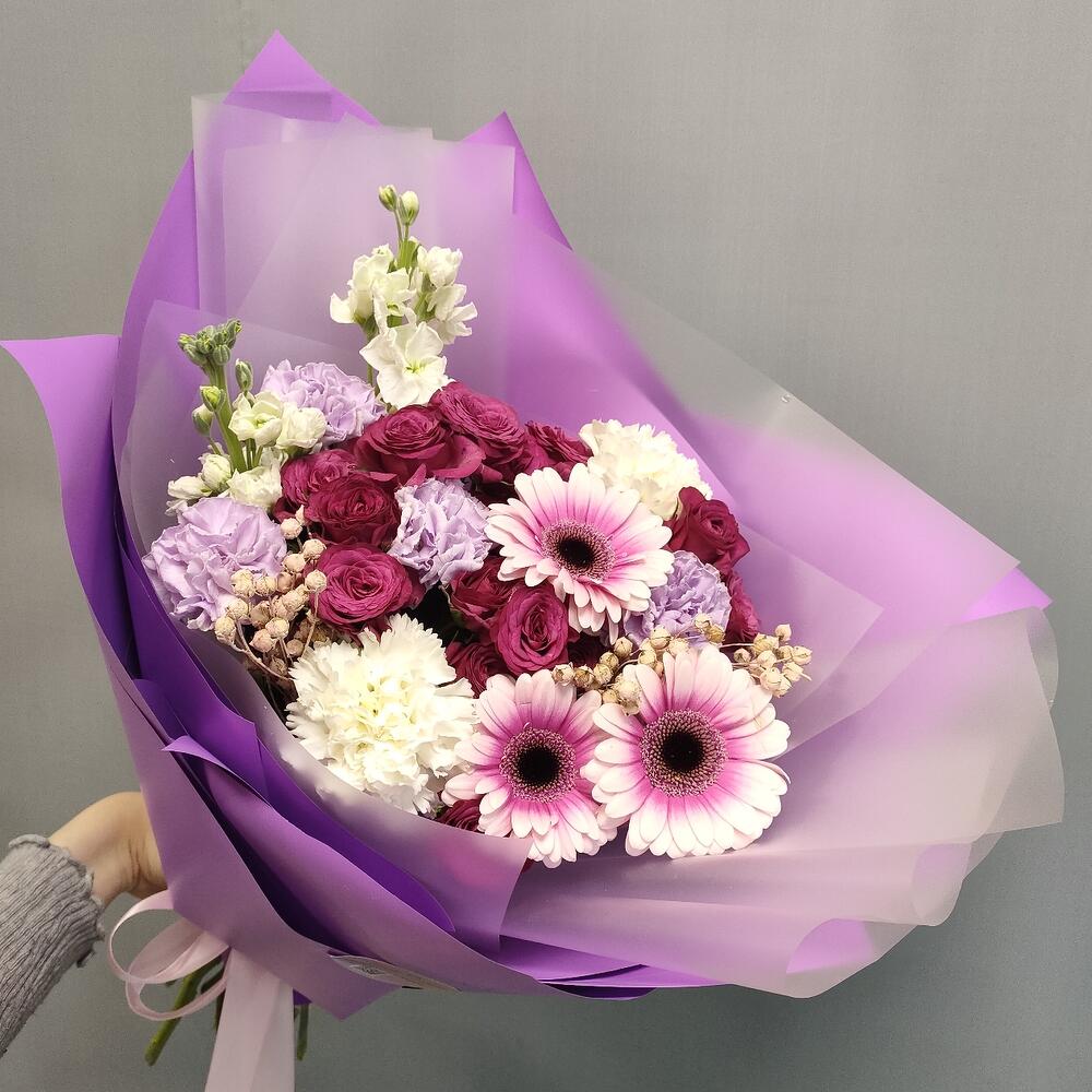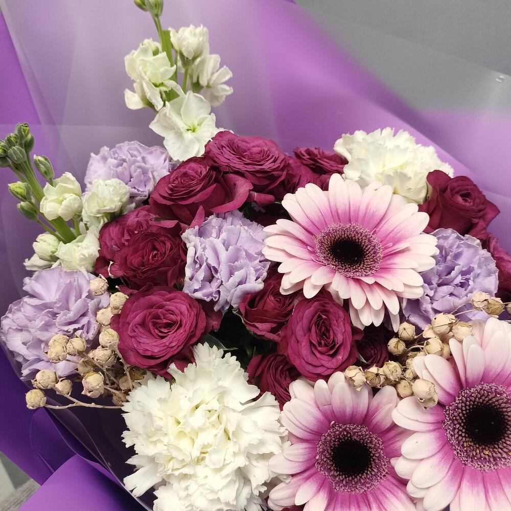 Альстромерии, Гвоздики, Кустовые розы, Лизиантусы, Розы, Хризантемы