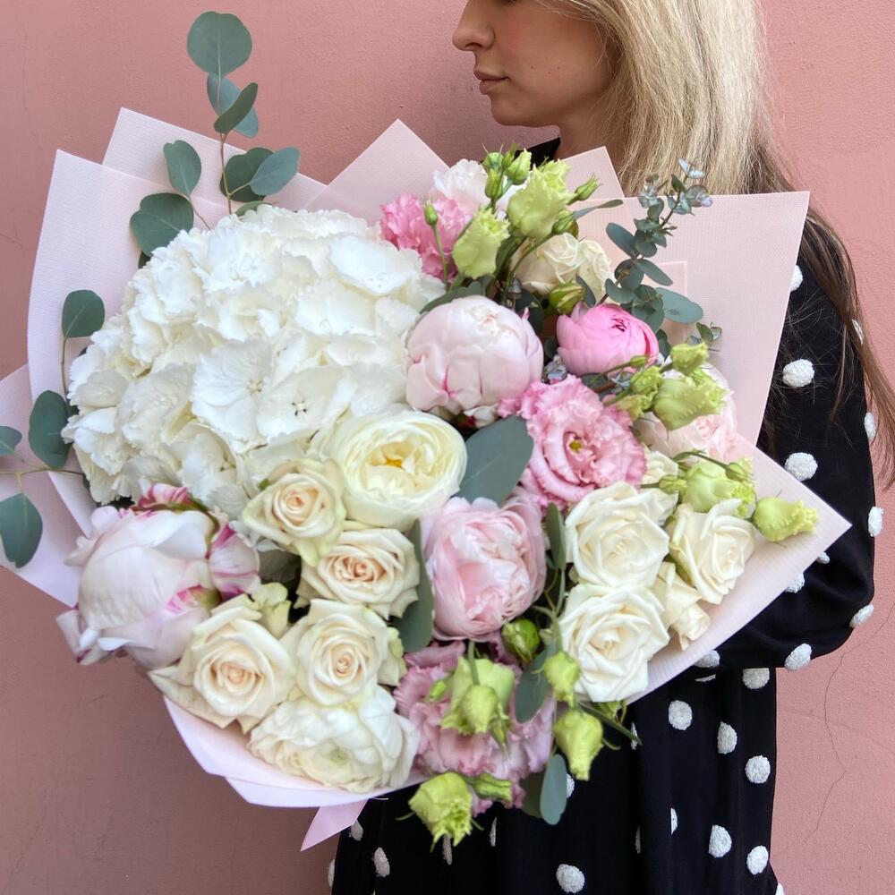 гортензия белая или розовая – 1 шт.Пион – 5 шт.Роза кустовая пионовидная – 5 шт.Лизиантус – 5 шт.Дизайнерская упаковка – 1 шт.открытка с вашими пожеланиями – 1 шт.