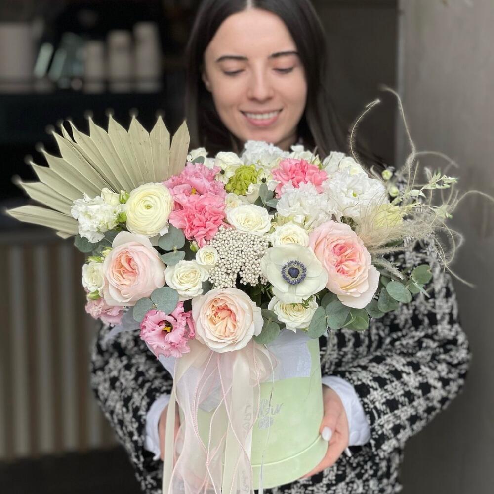 Пионовидная роза – 3 шт.Ранункулюс – 1 шт.Анемон – 1 шт.Махровый лизиантус – 4 шт.Озотамнус – 1 шт.Диантус – 4 шт.Роза кустовая жанин – 5 шт.пальму сухоцвет – 1 шт.Стифа – 1 шт.орнитоналум – 2 шт.Эвкалипт – 5 шт.