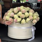 Оазис – 8 шт. Коробка – 1 шт. Оформление – 1 шт. роза белая и розовая – 75 шт.