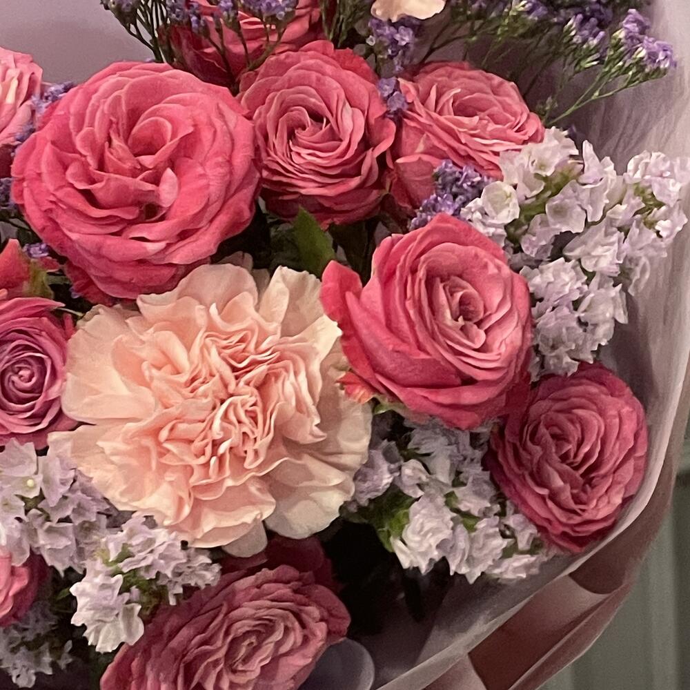 Сборный букет-комплимент, составленный в лиловых оттенках из изящных роз с пионовидным раскрытием, кружевных гвоздик, фактурной статицы и лимониума – чудесный сюрприз для любого повода, готовый создать прекрасное настроение.
