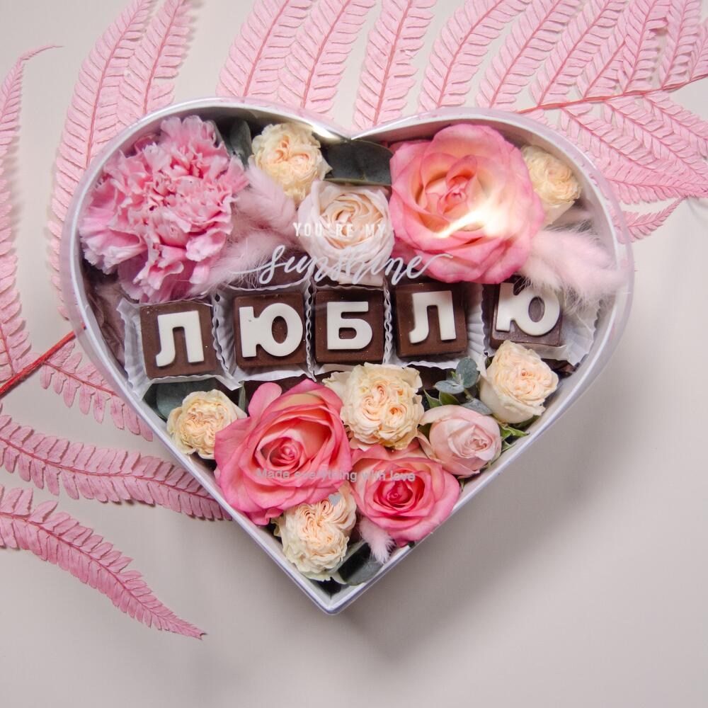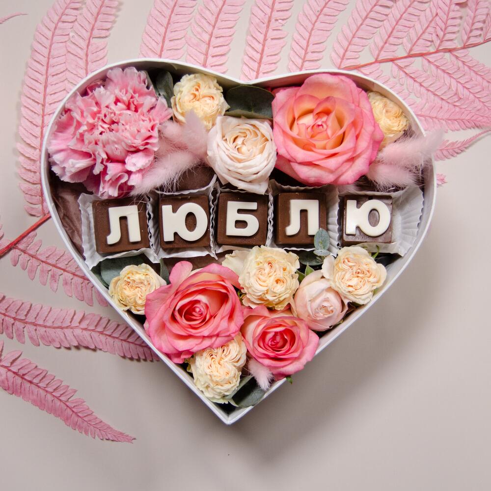 Шоколадные буквы – 5 шт. Коробка – 1 шт. Гвоздика – 1 шт. Роза кустовая – 3 шт. Роза сортовая – 3 шт.