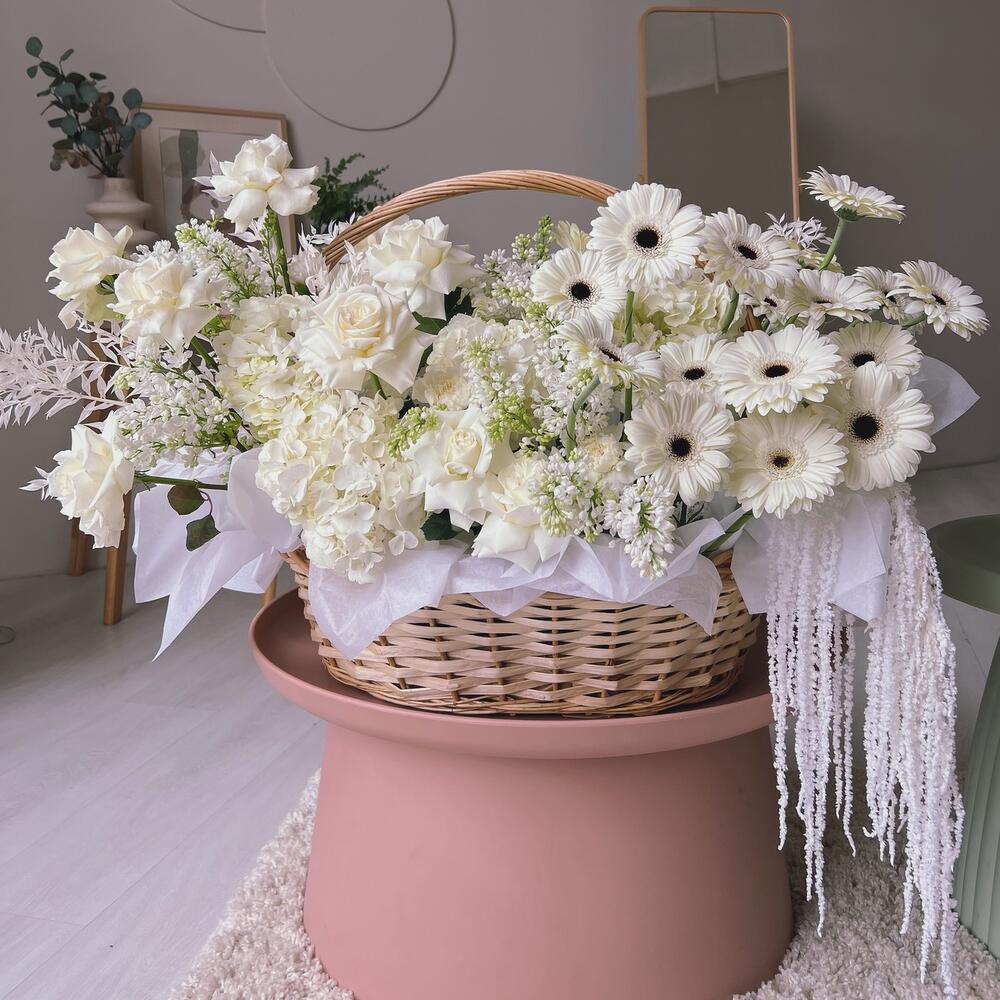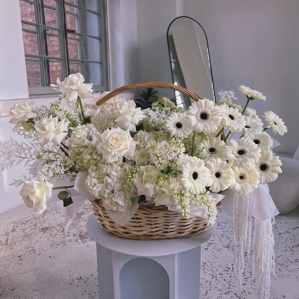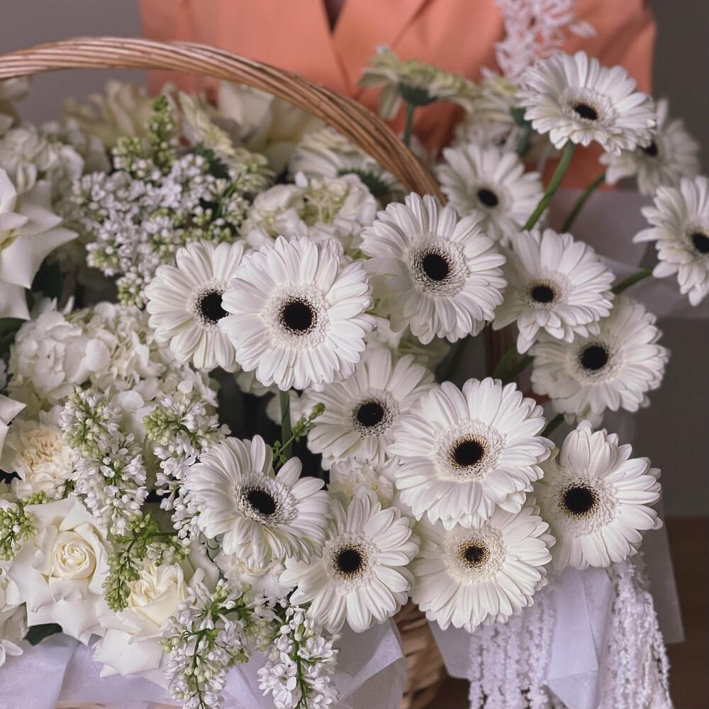 Шикарная пышная белоснежная корзина с гортензиями и герберой