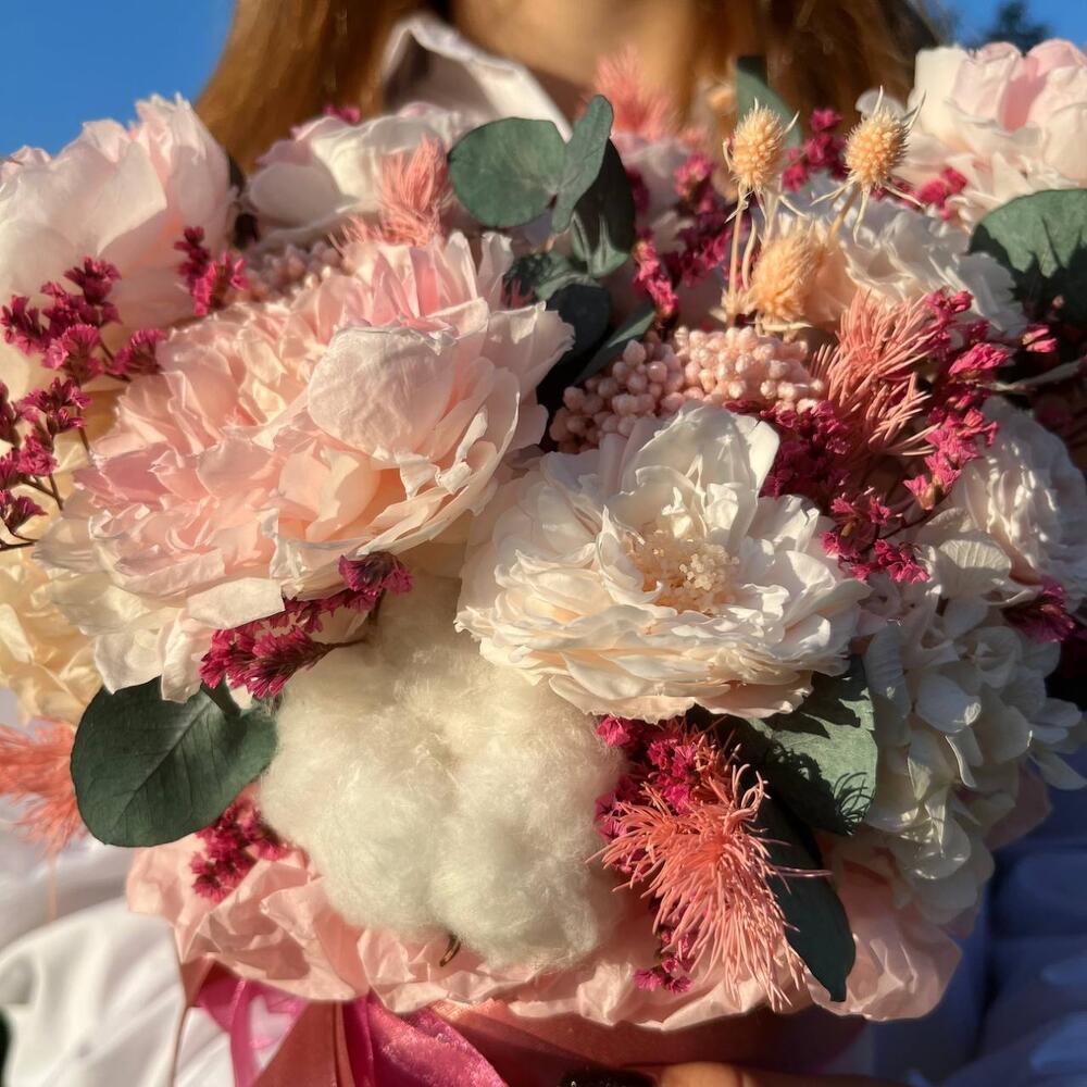 роза стабилизированная пионовидная крупная – 3 шт.роза стабилизированная пионовидная мелкая – 6 шт.гортензия стабилизированная пучок – 6 шт.эвкалипт стабилизированный ветка – 1 шт.папоротник стабилизированный лист – 2 шт.лимониум стабилизированный пучок – 1 шт.аспарагус стабилизированный пучок – 1 шт.эрингиум стабилизированный пучок – 1 шт.озотамнус стабилизированный пучок – 3 шт.Шляпная коробка с лентами – 1 шт.