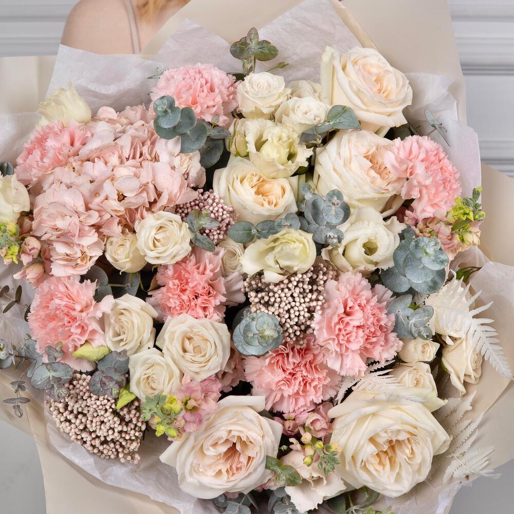 Гортензия – 1 шт.Эвкалипт – 5 шт.Маттиола – 7 шт.Эустома – 4 шт.Озотамнус – 3 шт.Диантус – 7 шт.Кустовая пионовидная роза – 5 шт.white o’hara – 5 шт.Упаковка дизайнерская – 2 шт.Писташ – 1 шт.Папоротник – 3 шт.
