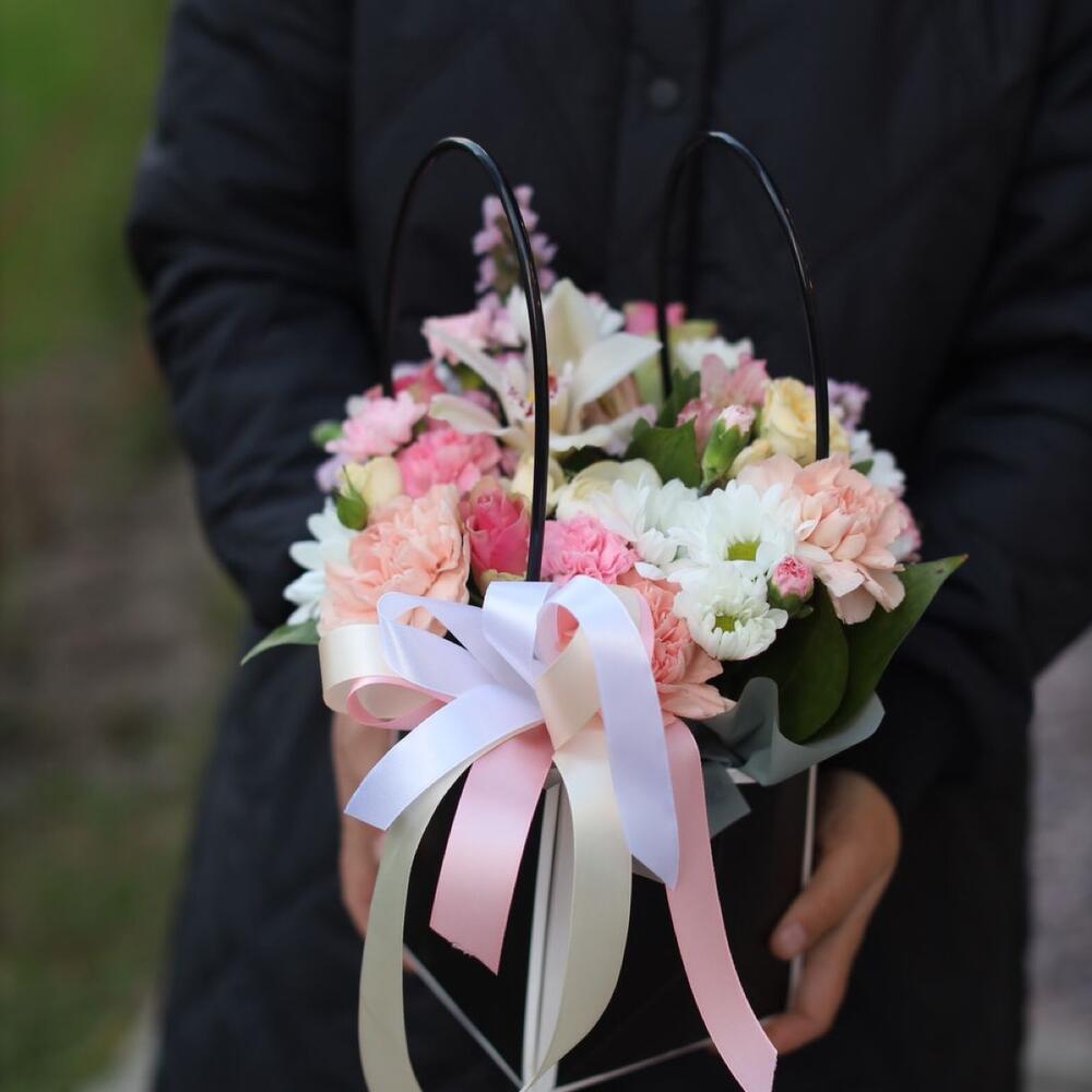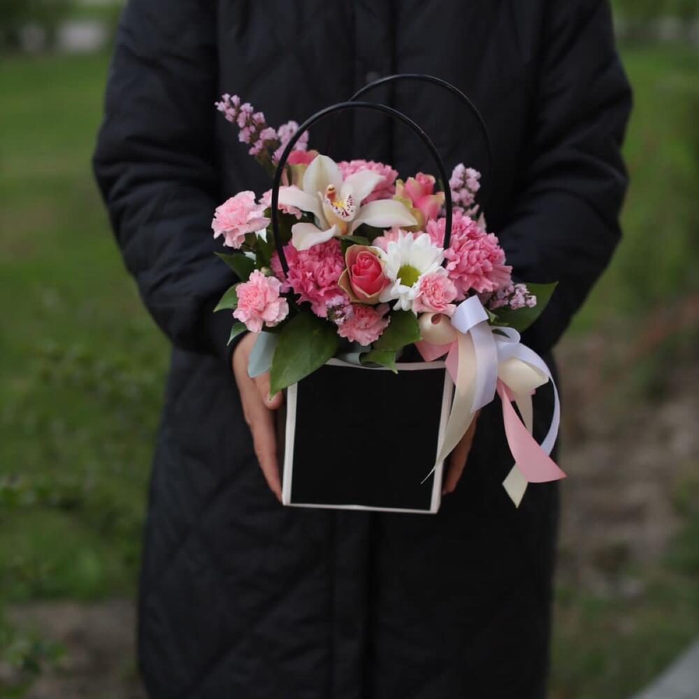 Цимбидиум белый – 1 шт.Гвоздика кустовая – 3 шт.Хризантема кустовая – 2 шт.Роза – 3 шт.Гвоздика сортовая – 3 шт.Сумочка – 1 шт.зелень декоративная – 10 шт.