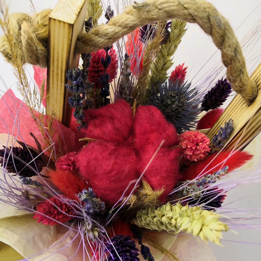 Лагурус – 19 шт.Хлопок – 1 шт.Лаванда (сухоцвет) – 11 шт.Пшеница (сухоцвет) – 8 шт.Тишью – 1 шт.Ящик – 1 шт.Лента атласная – 1 шт.Оазис – 1 шт.