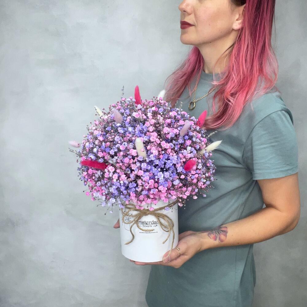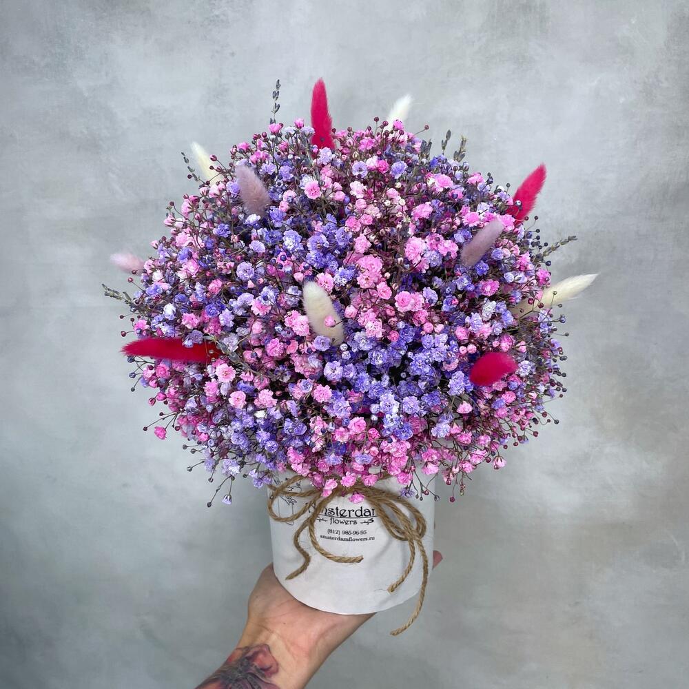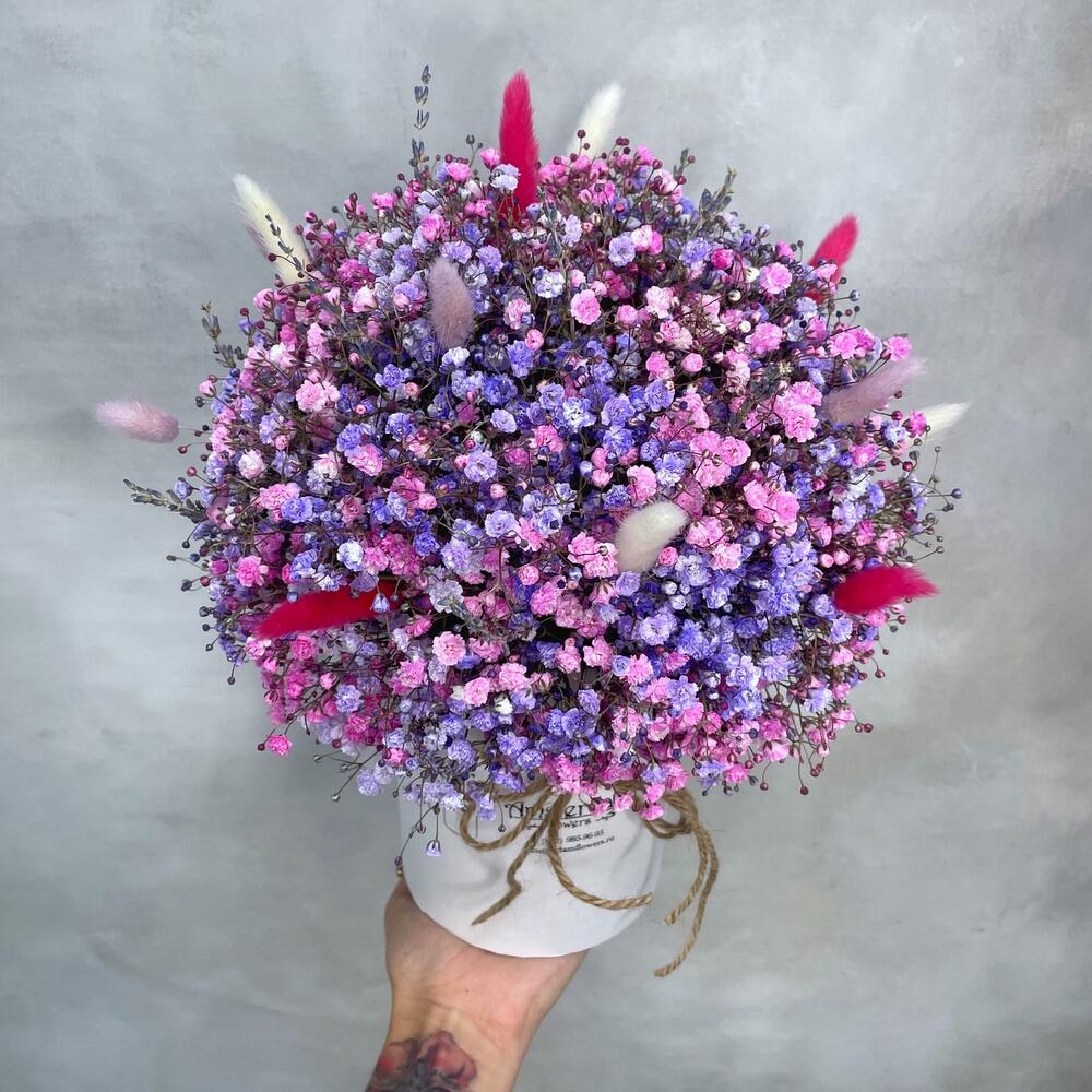 Лаванда – 15 шт.Оазис – 1 шт.Коробка d12 – 1 шт.Лагурус (сухоцвет) – 15 шт.гипсофила цветная – 9 шт.